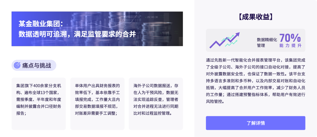 以国产化安全底座与AI智能引擎为核心,实现多源异构数据整合、自动化关联交易对账及合并抵销,提供多口径报表实时输出与动态监控分析能力,支持各种复杂合并场景