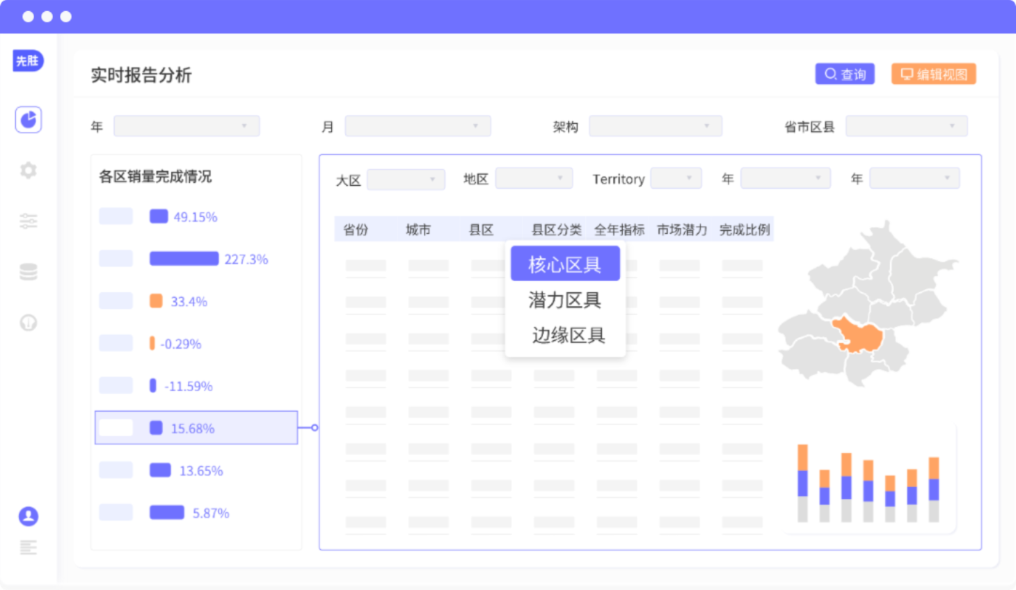 支持实时查看销售数据、月度完成情况排名、产品贡献度分析、分角色探索等