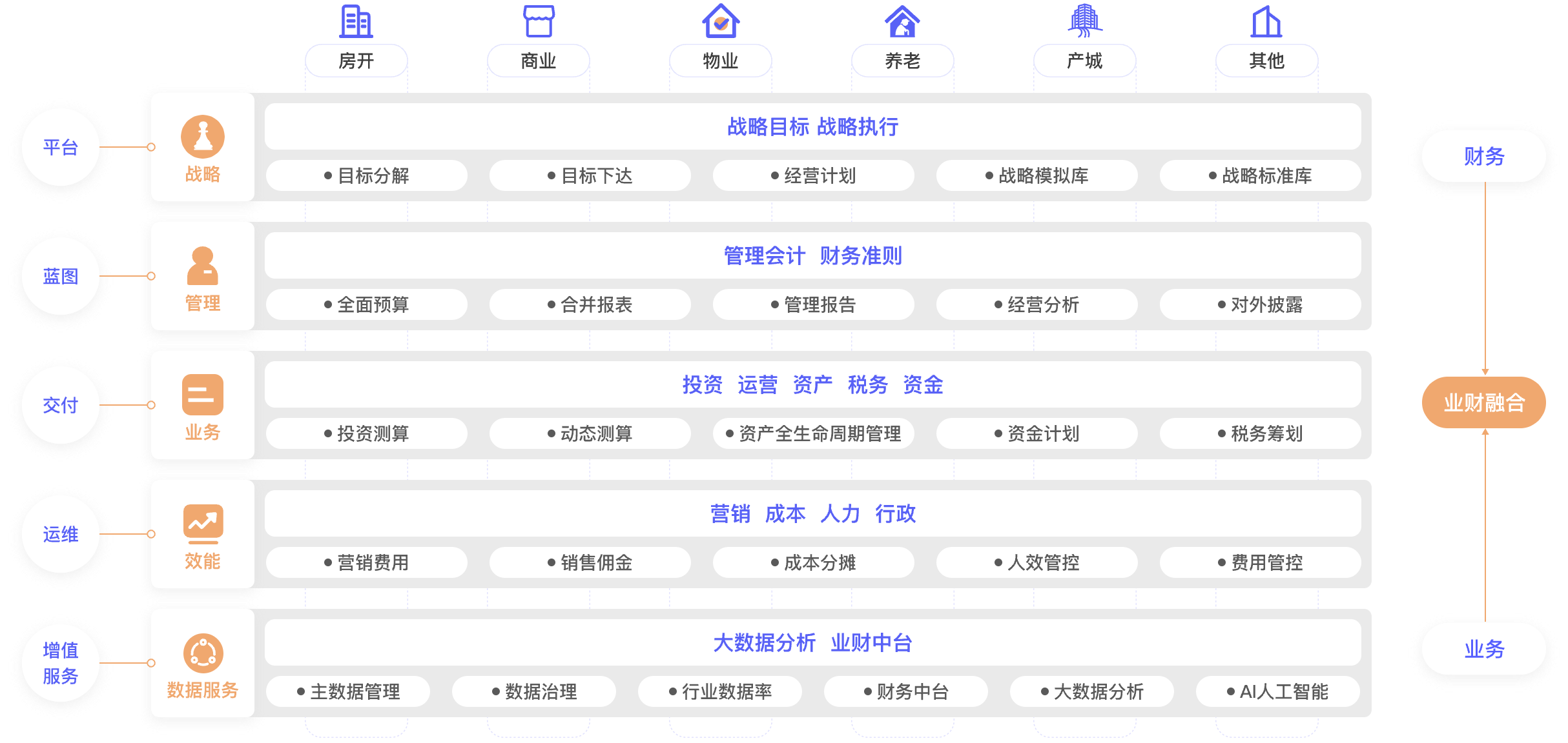 基于场景化的业财融合应用,连接每个业务动作与财务结果,构建房地产企业业财联动的经营管控体系,夯实数据决策场景,提升运营管控能力。