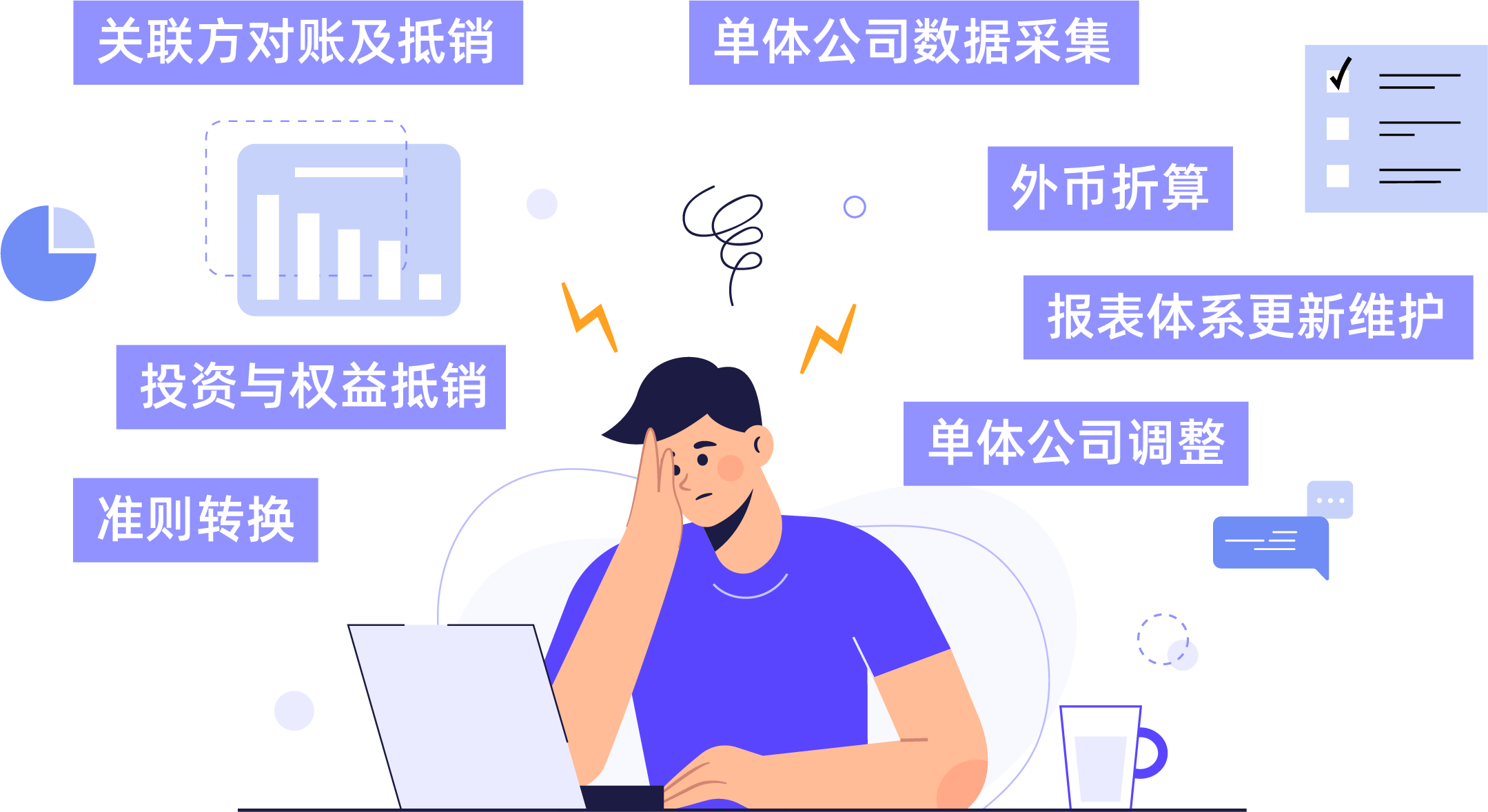 许多大型企业投入了大量资源和精力上线了合并报表系统,然而在实际使用过程中依然会面临由于业财数据质量治理能力不足所导致的关联方对账及抵销、报表体系更新维护、单体公司数据采集、投资与权益抵销、单体公司调整、准则转换、外币折算等方面耗费大量的精力,严重影响报表编制的效率。
