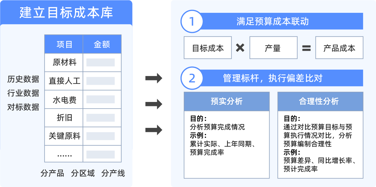 将集团降本目标按 成本要素(如材料/工时)拆解至各项目,确保财务目标→业务目标可追溯。