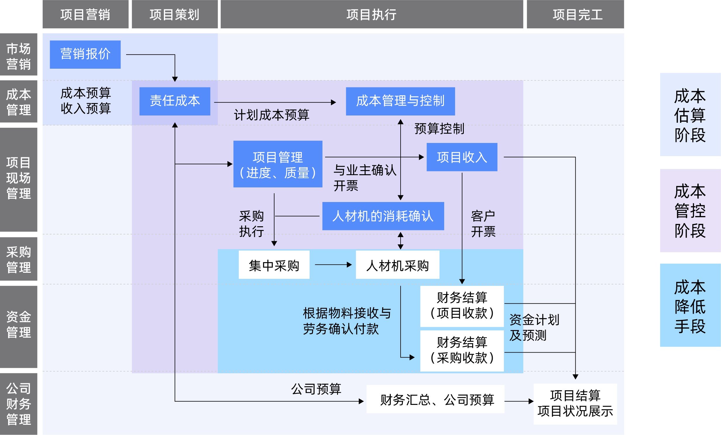 -成本改善执行——从总项目视角比对报价/签约/目标/预测差异,进行偏差分析;再根据差异修订标准成本;将改善结果反馈至新项目目标成本设定,形成PDCA循环。