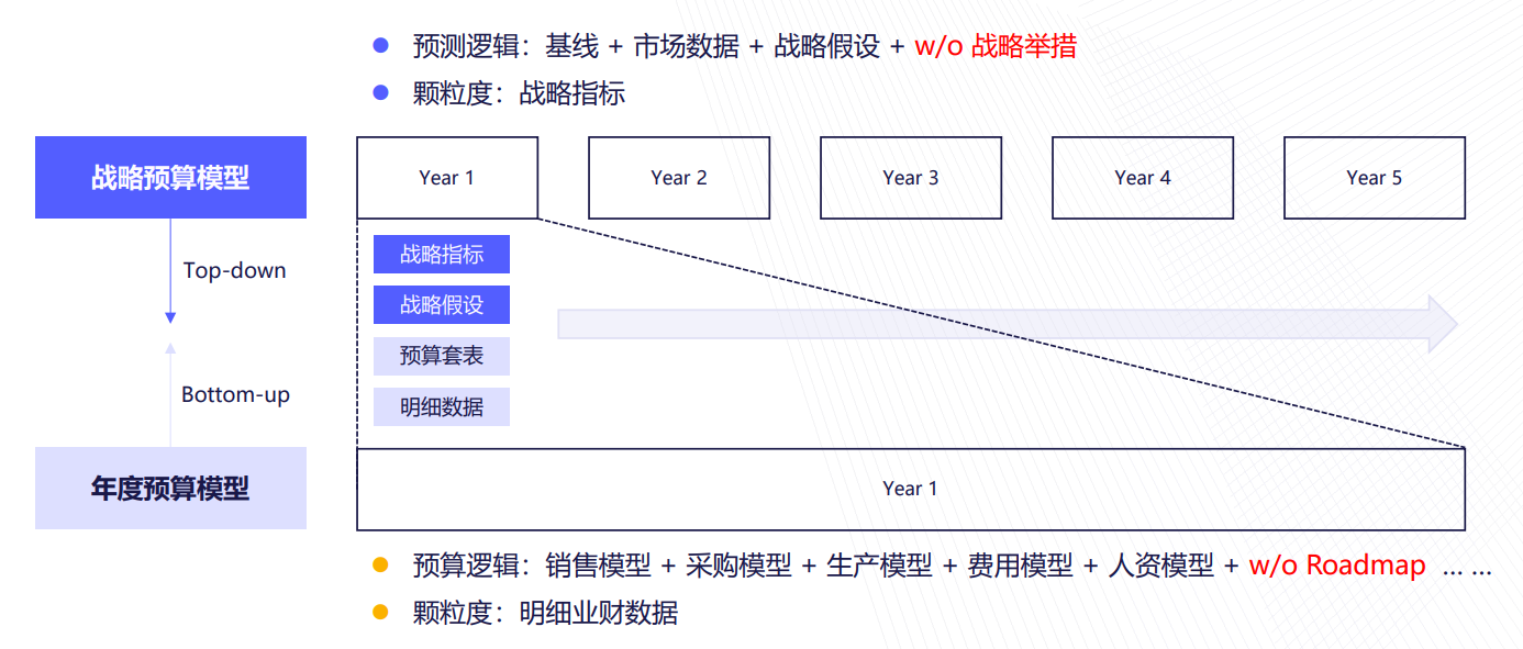 挑战:战略预测到年度预算继承的重难点是「颗粒度如何对齐」。公司高层制定的战略降本目标在向研发、采购、生产等部门分解时,常因缺乏统一的承载平台与精细数据模型而流于形式,导致战略举措(Roadmap)与具体预算资源脱节。