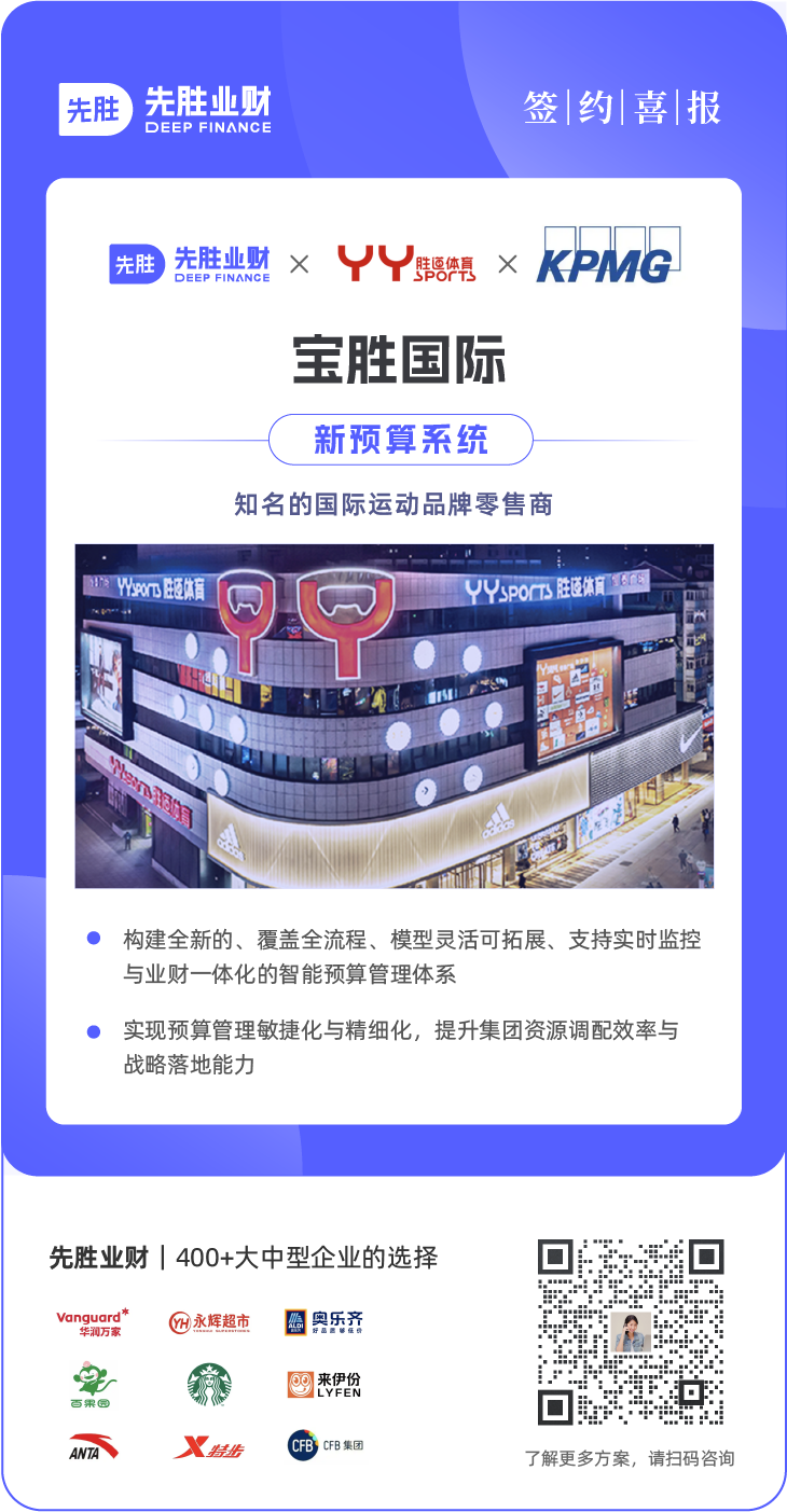 先胜业财助力知名国际运动品牌零售商——宝胜国际构建新预算管理系统,打造全新的、覆盖全流程、模型灵活可拓展、支持实时监控与业财一体化的智能预算管理体系,实现预算管理敏捷化与精细化,提升集团资源调配效率与战略落地能力。